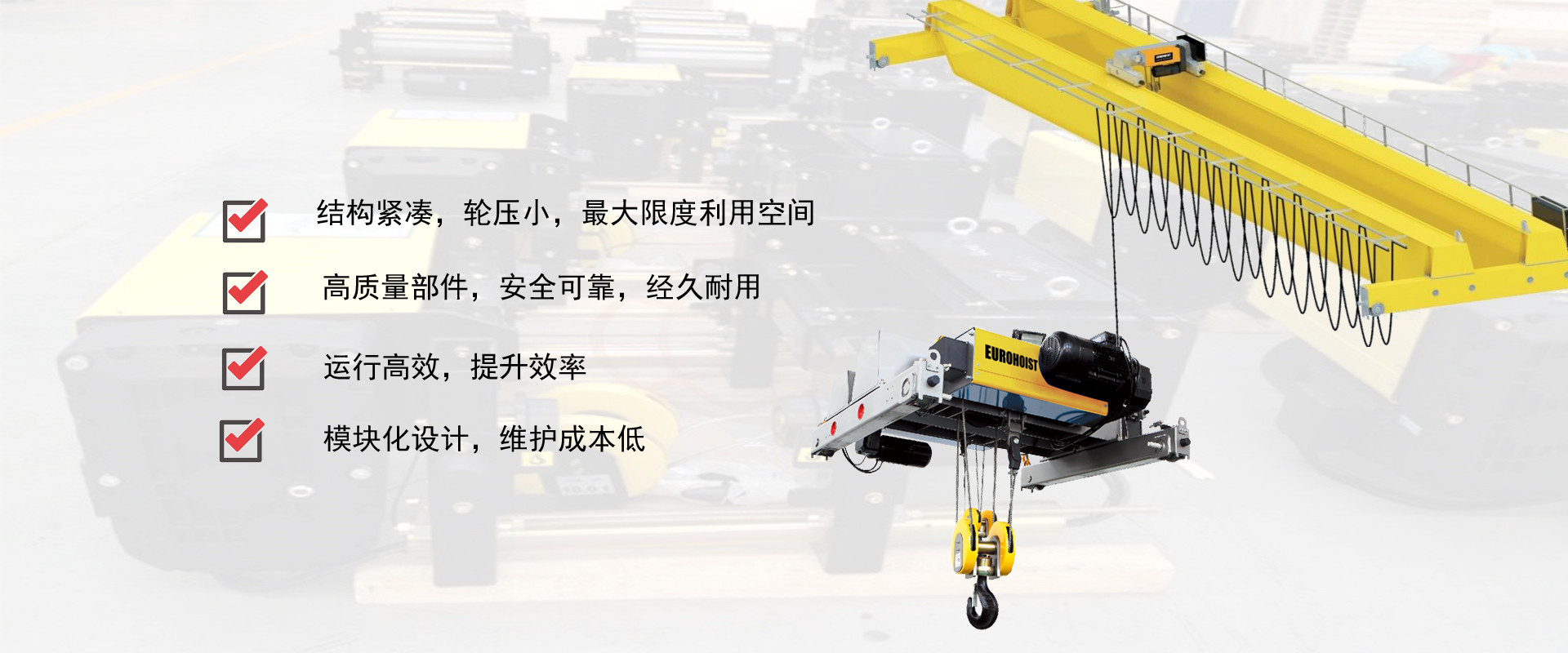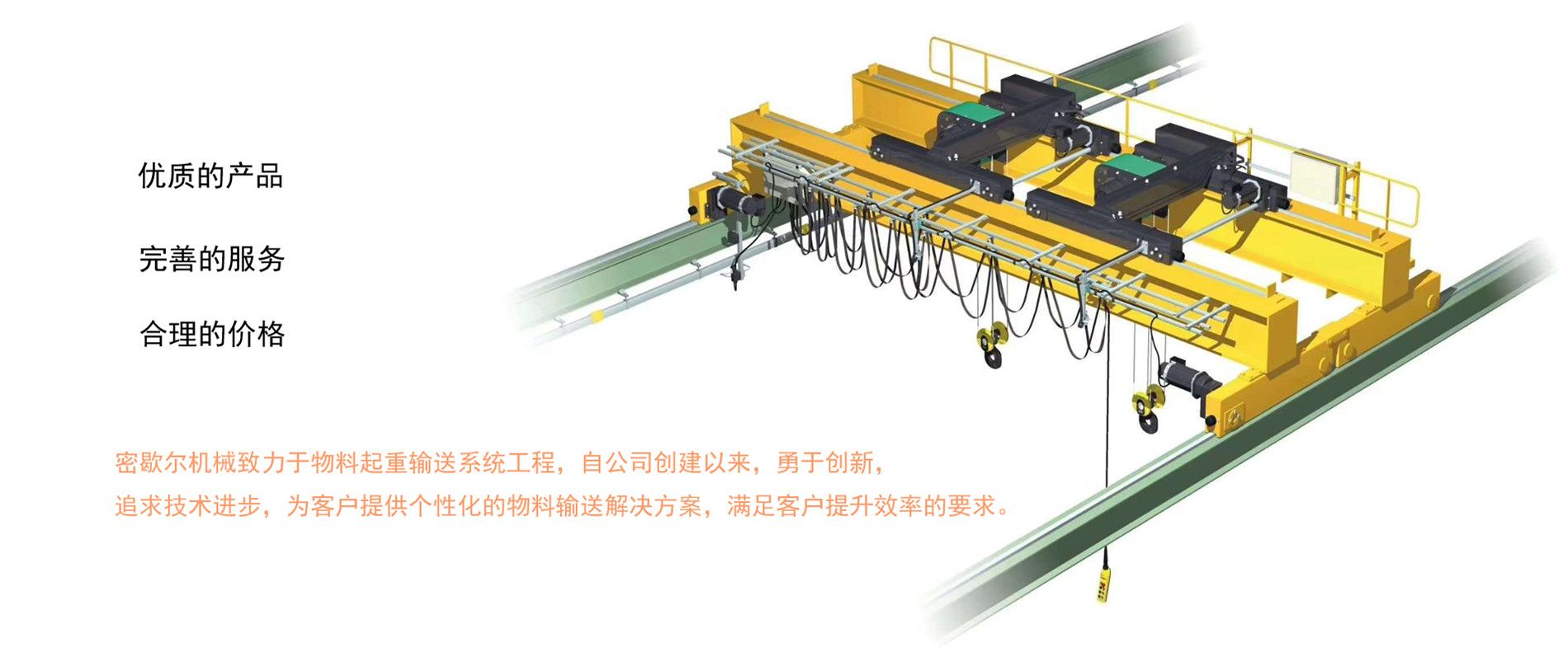 密歇爾起重機(jī)械(杭州)有限公司提供全面的起重輸送產(chǎn)品和服務(wù),產(chǎn)品覆蓋環(huán)鏈電動葫蘆(125Kg-80T),歐式鋼絲繩葫蘆,防爆葫蘆,懸臂吊,KBK柔性起重機(jī),歐式起重機(jī),起重馬達(dá),端梁,起重移動供電系統(tǒng)等,在國內(nèi)外被廣泛的應(yīng)用于生產(chǎn)車間,汽車,模具,機(jī)械制造,鐵路,船舶,物流搬運(yùn),現(xiàn)代化工廠流水線等工業(yè)及其它特殊用途。